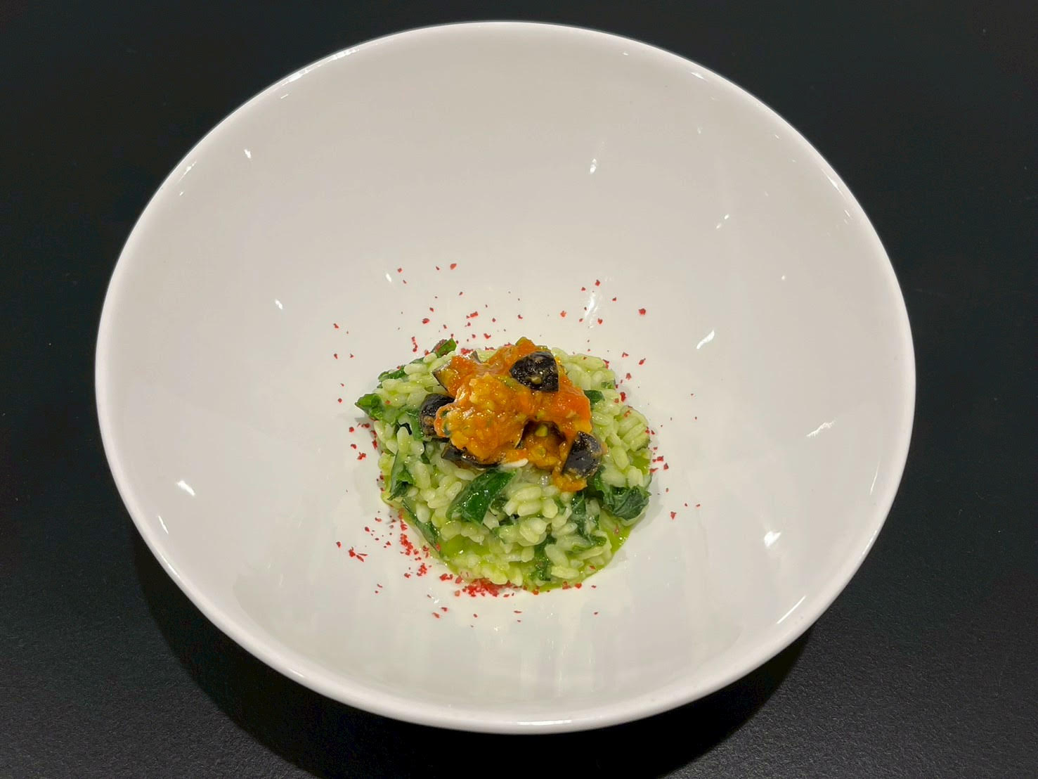 【グリーンリゾット タコをトマトで煮込んだラグーソース】