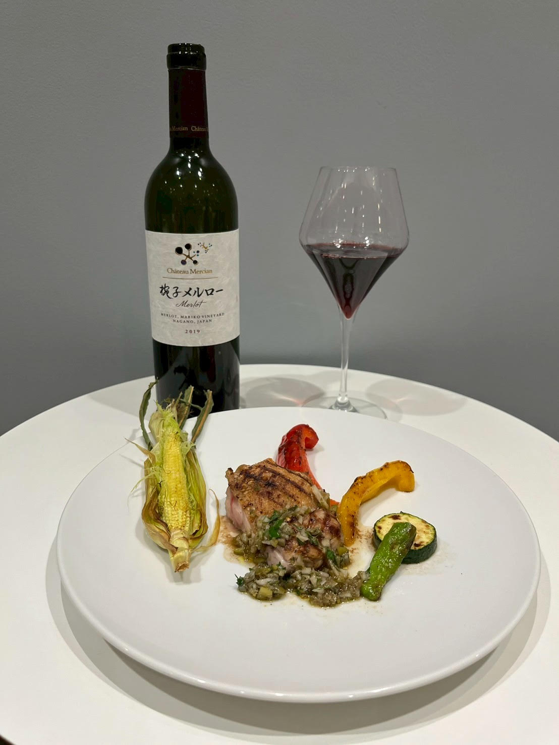 シンプルに鶏肉をグリルして夏野菜を乗せたお料理です。ソースもシンプルにラヴィゴットにして鶏肉をコブみかんの葉っぱで香り付けをしてワインに合わせてみました。